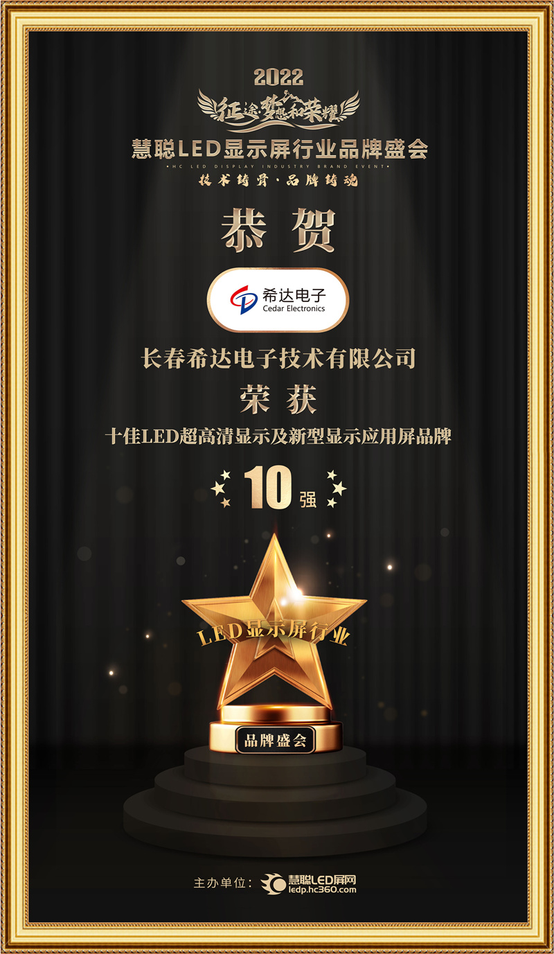 12月2日, 2022年度慧聰LED顯示屏行業品牌盛會十佳品牌評選結果重磅揭曉。希達電子再登榮譽榜單并憑借強大的品牌影響力和技術創新力斬獲本年度“十佳LED 顯示屏行業知名品牌”、“十佳LED超高清顯示及新型顯示應用屏”兩項大獎,希達電子以硬核科技實力詮釋匠心智造擔當,賦能LED顯示行業創新發展。
